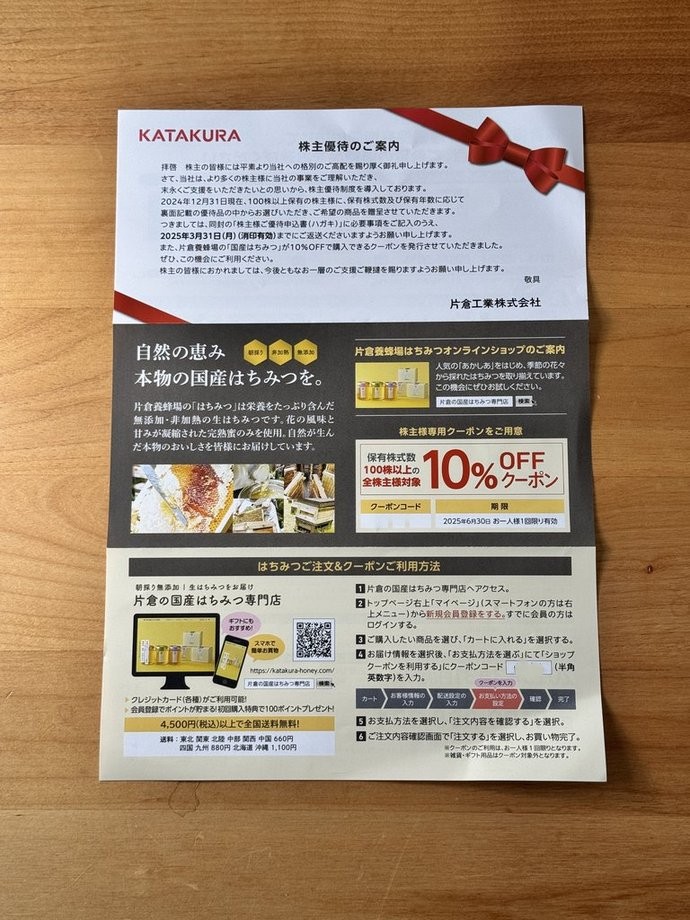 また、株主全員に対して「片倉の国産はちみつ専門店」で使える10%OFFクーポンも進呈されます。
