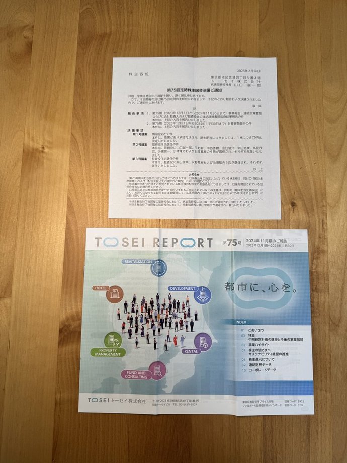 | 100株以上(11月末) | トーセイホテル宿泊割引券 3,000円分 |