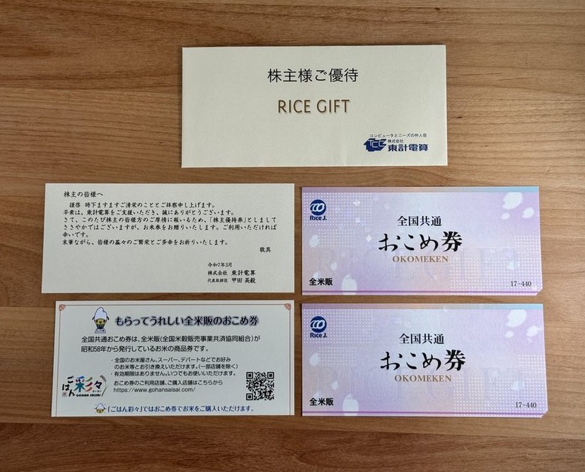 東計電算の株主優待は非常にシンプルで、100株保有で毎年12月末の権利確定でおこめ券2kg分がもらえるという内容です。
